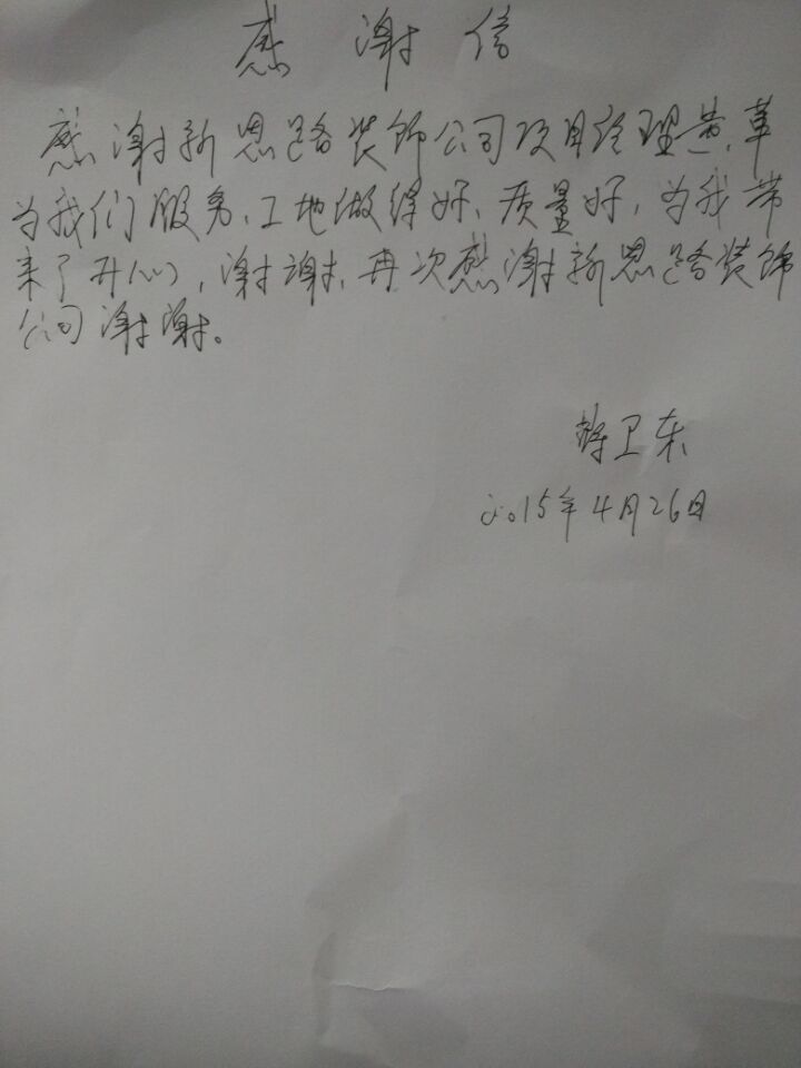 在信中,蔣老師表達了對新思路裝飾和黃工長的感謝之情:“感謝新思路裝飾公司,也感謝黃工長,工地做得好,服務(wù)好,為我?guī)砹碎_心,再次謝謝”!