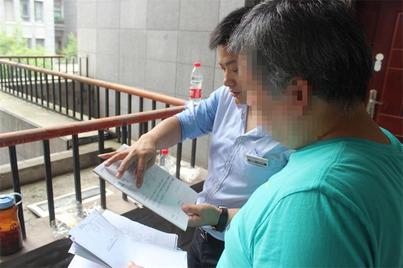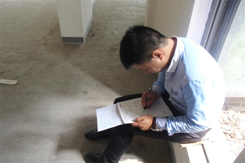 工程質(zhì)檢正在認(rèn)真填寫客戶服務(wù)手冊,以確認(rèn)本次進(jìn)場交底符合公司工程施工管理的相關(guān)規(guī)定。