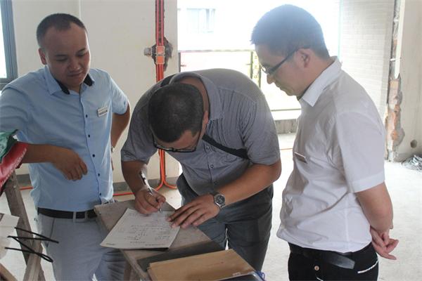業(yè)主、設(shè)計師、項目經(jīng)理三方商討廚房水管改造方案