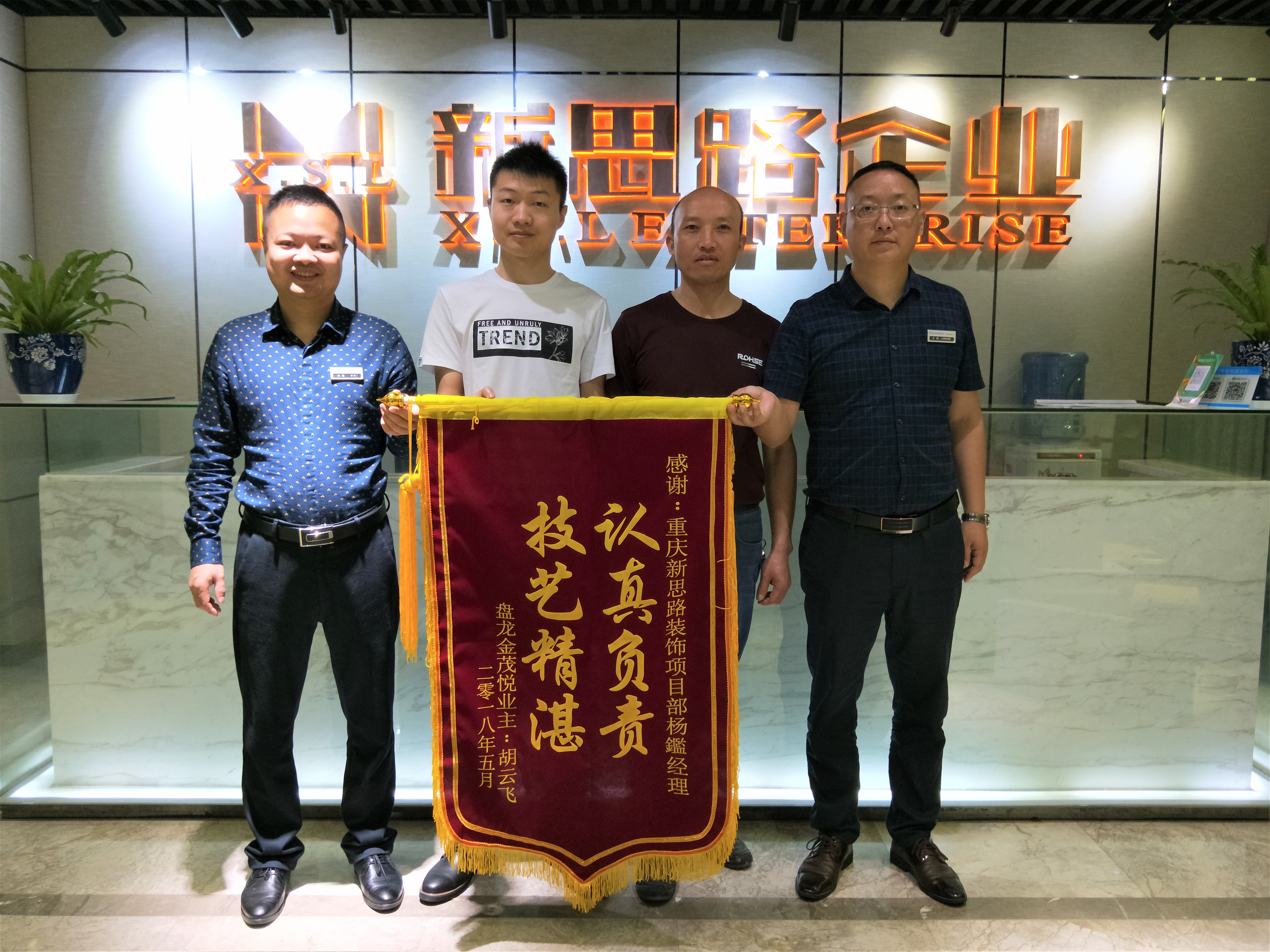 都說一日之計在于晨,22日上午工作伊始,就喜獲來自盤龍金茂悅業(yè)主胡老師錦旗一面。上書“認真負責,技藝精湛”八字。這短短八字卻彰顯著胡老師對新思路裝飾精湛的施工工藝和整個裝修過程的體驗滿意度。