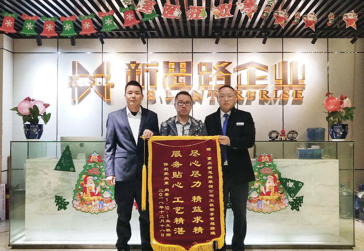 2018年12月24日下午,來自保利愛尚里·尚景的業(yè)主鐘老師專程來到南坪總部,將一面印有“盡心盡力,精益求精,服務(wù)貼心,工藝精湛”的錦旗交給我們的項目經(jīng)理李經(jīng)理手中,以感謝新思路裝飾高品質(zhì)工藝和優(yōu)質(zhì)貼心的家裝服務(wù)。