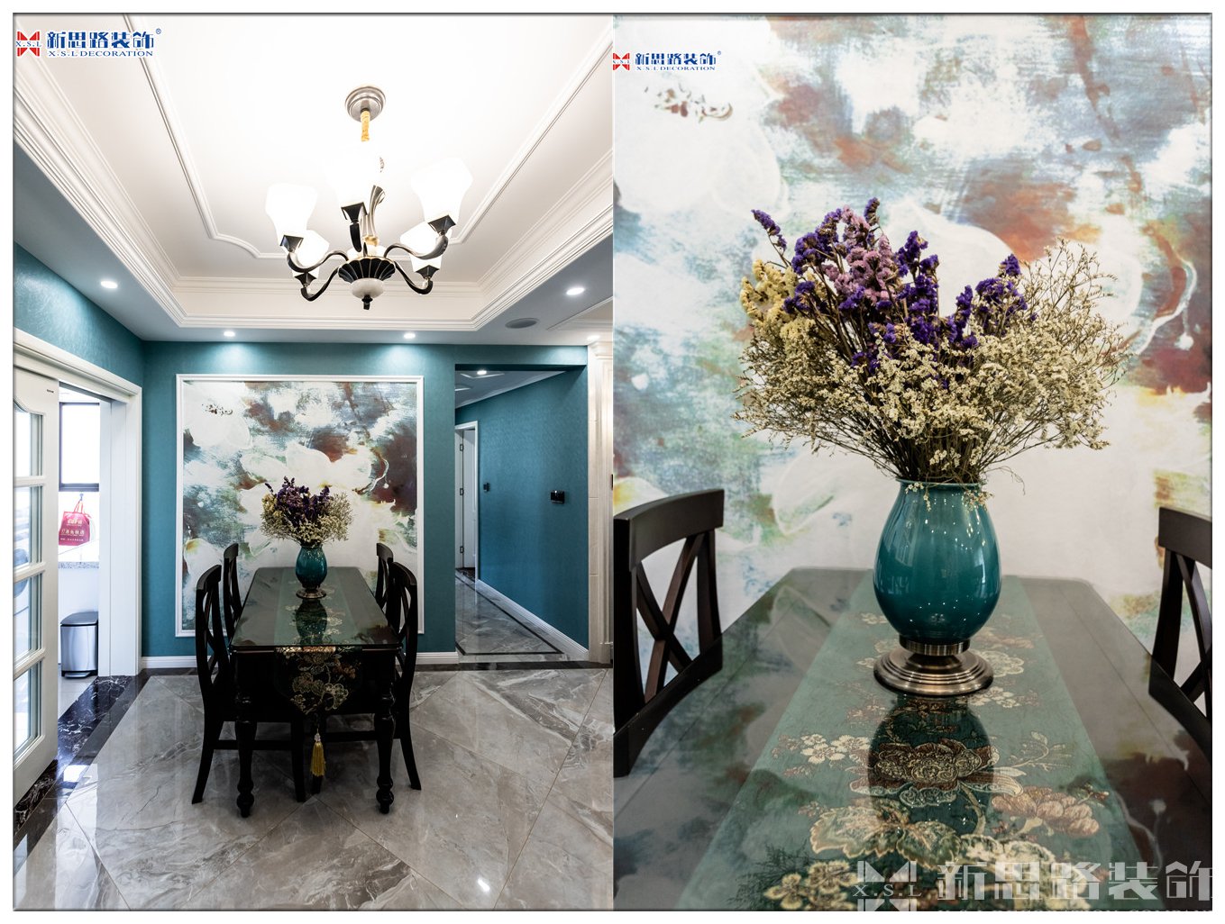 沙發(fā)背景墻使用石膏線材勾畫幾何圖形,古典優(yōu)雅;陶瓷的小鹿漫步花間,野趣橫生。復(fù)古花色的窗簾與真皮質(zhì)地的沙發(fā)以及實(shí)木電視柜搭配起來正合適,線條分割成菱形網(wǎng)格狀的乳白色電視背景墻大方低調(diào),黃銅色美式吊燈干凈明亮。深墨綠色的織錦桌旗無形中又添了點(diǎn)奢華意味,油青色的仿古裝飾擺件也是非常經(jīng)典的美式元素體現(xiàn)。
