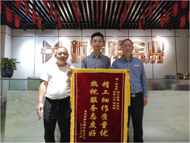 9月21日,來自藍(lán)光林肯公園的業(yè)主王先生在休息日,專程前來新思路裝飾總部,將一面寫著“精工細(xì)作質(zhì)量優(yōu),熱忱服務(wù)態(tài)度好”的錦旗贈(zèng)送給項(xiàng)目經(jīng)理熊維進(jìn)與銷售代表?xiàng)罱ㄝx,以感謝新思路裝飾公司精湛的施工技藝與熱情周到的服務(wù)。