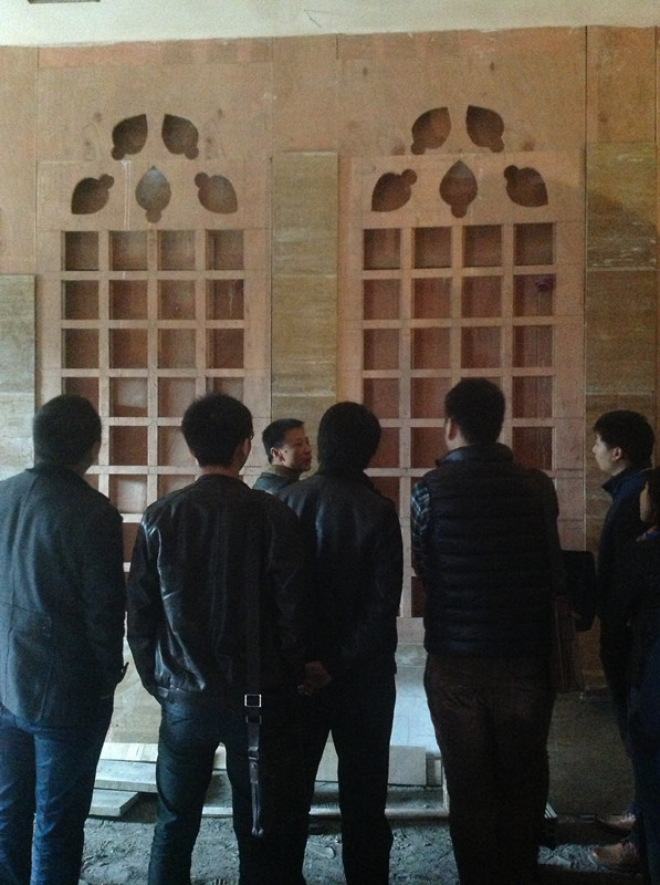 譚經(jīng)理在向設(shè)計師介紹木工吊頂工藝細節(jié)