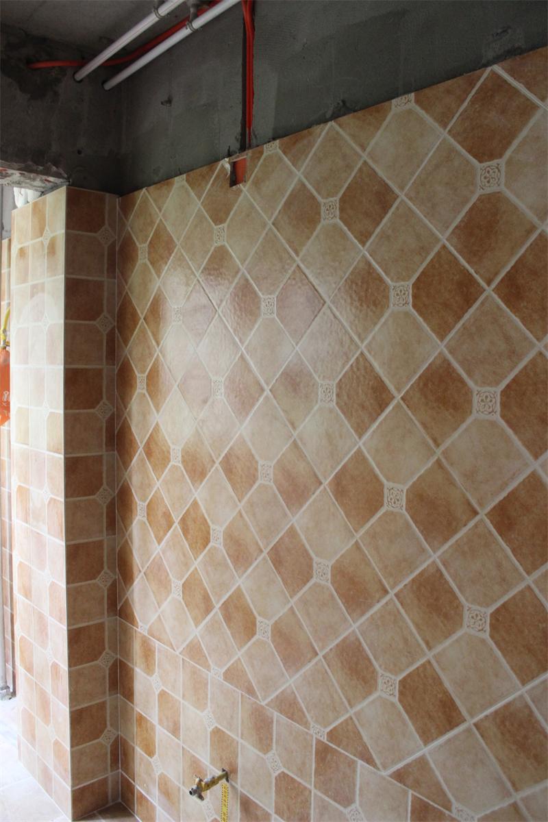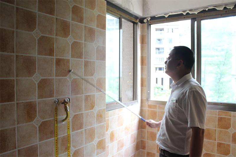 文經(jīng)理正在認真檢查墻磚鋪貼情況