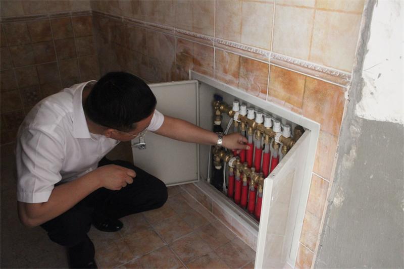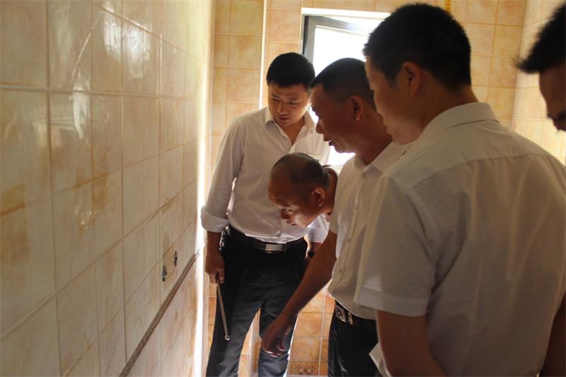 巡查成員正在仔細檢查衛(wèi)生間給水管施工情況