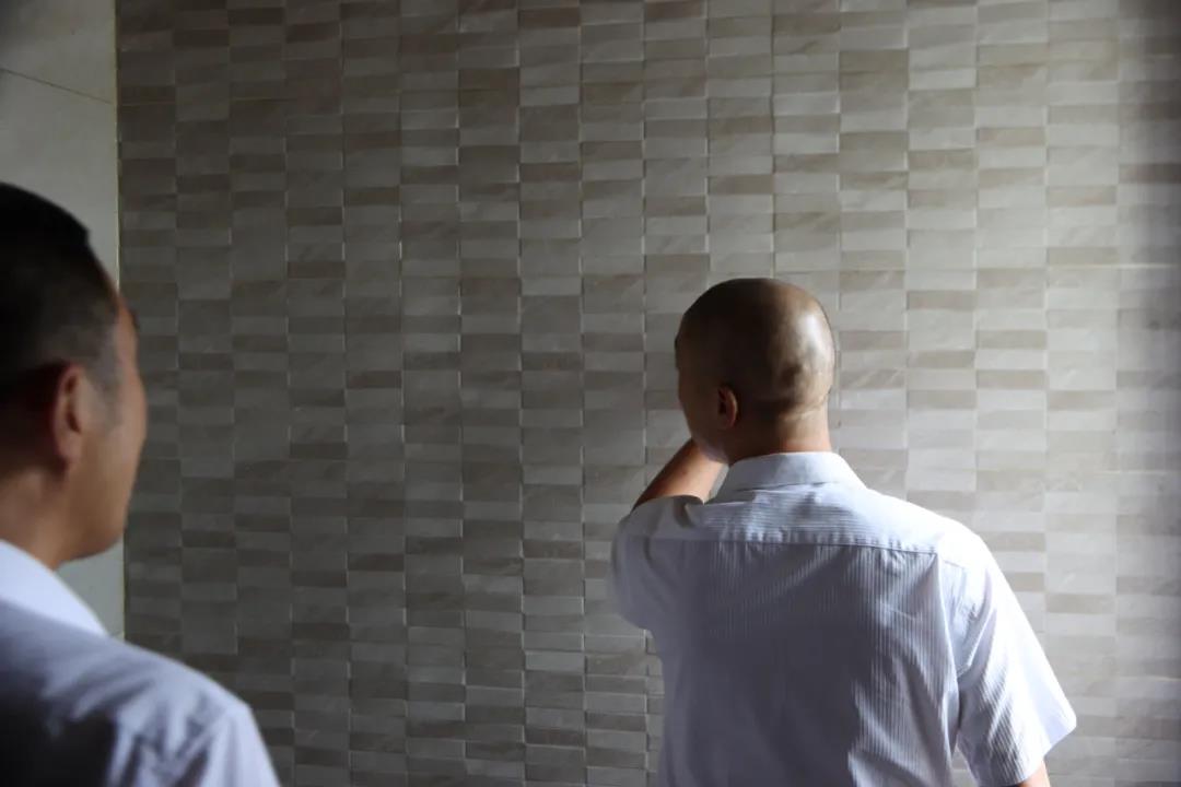 工程部檢查正在檢查瓷磚鋪貼是否平整、瓷磚縫是否合格,給工人再次強(qiáng)調(diào)我們新思路裝飾的施工規(guī)范。