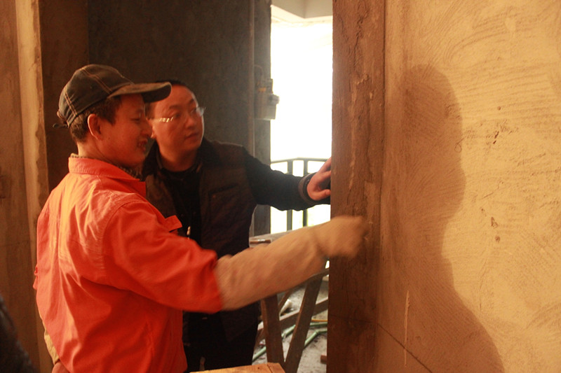 工人師傅正在介紹墻面基層施工細(xì)節(jié)