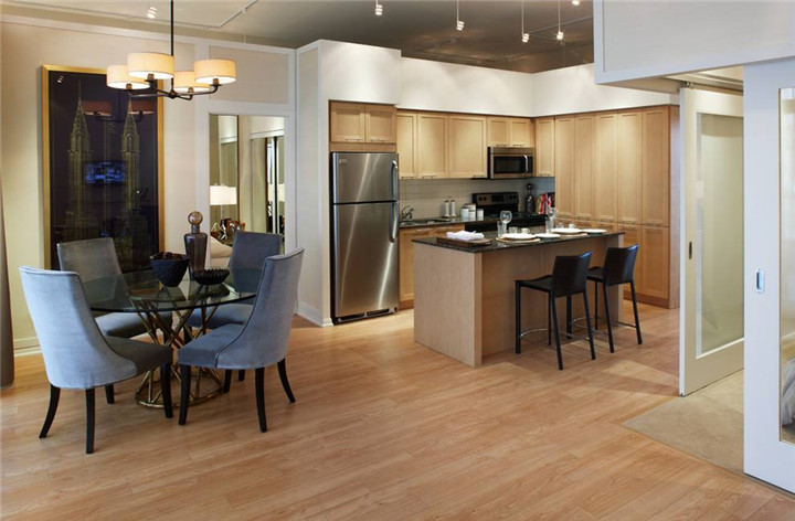 6:留出足夠回轉(zhuǎn)空間。餐桌椅在開放式廚房間的擺放,必須注意要留出烹飪操作空間。