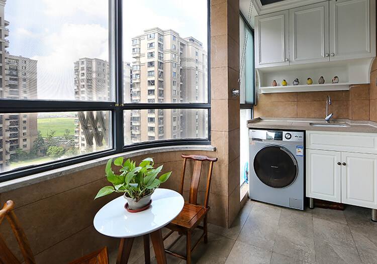 如果只是簡單的白墻,這樣的設(shè)計未免顯得很單調(diào)、枯燥。如上面的小戶型陽臺裝修效果圖所示,將木質(zhì)與磚墻結(jié)合,整體設(shè)計就變得豐富起來。陽臺空間中預(yù)留一個位置,可以用來放置洗衣機,小巧簡單又實用。
